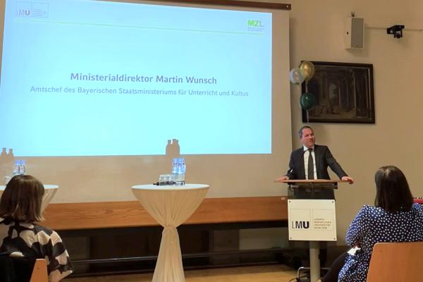 Zu den Grußwortsprecher:innen beim anschließenden Festakt zählten von Seiten der LMU Prof. Dr. Christiane Lütge, Direktorin des MZL, und Prof. Dr. Jochen Kuhn, Vizepräsident für Innovation in Lehre und Lehrkräftebildung. Auch Ministerialdirektor Martin Wunsch, Amtschef des Bayerischen Staatsministeriums für Unterricht und Kultus, richtete ein Grußwort an die Gäste. Frau Lütge blickte auf die zwanzigjährige Erfolgsgeschichte des MZL zurück und gab einen Ausblick auf die aktuellen und zukünftigen Herausforderungen der (universitären) Lehrkräftebildung. Herr Kuhn betonte die zentrale Rolle von Lehrkräftebildungszentren an Universitäten im Allgemeinen und dem MZL an der LMU in Speziellen und auch Herr Wunsch rückte die Wichtigkeit der Lehrkräftebildungszentren für die Lehrkräftebildung und damit die Gesellschaft in den Vordergrund.
